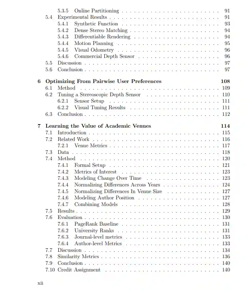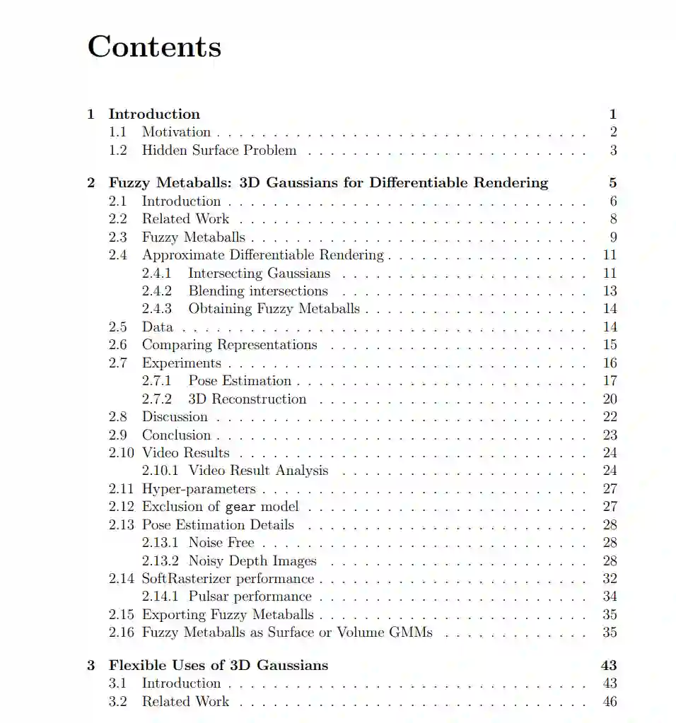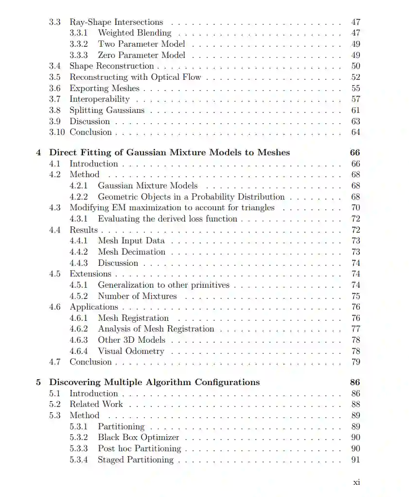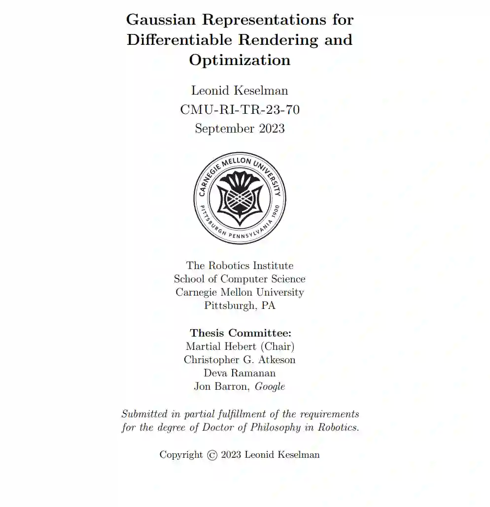 在这篇论文中,我们探讨了一些快速、稳健和高效的方法,这些方法在许多领域都具有普遍的适用性。具体来说,我们探讨了高斯表示在计算机视觉和机器人学的多个应用领域中的使用。 在第一部分,我们为经典的隐藏表面问题提供了一个替代方法。具体而言,我们为3D高斯设计了一个基于射线的可微渲染器,它可以用于以统一方式解决多个经典的计算机视觉问题。例如,我们可以仅基于梯度优化从颜色、轮廓或光流重建3D形状;这些重建对输入错误具有鲁棒性,且相当快速(在笔记本电脑CPU上需要几分钟)。同样地,我们可以求解已知对象的精确相机姿势估计,与经典方法给出的质量相当。我们的贡献包括隐藏表面问题的替代公式,牺牲了保真度以换取实用性,从而获得了快速的运行时间和高质量的梯度信息。我们扩展了这个渲染器,加入了可微光流,并展示了如何从重建中导出彩色网格。我们展示了从日常物体的自然采集视频上的示例。我们还将介绍我们如何直接从网格中获得3D高斯表示,而不需要采样点集的工作。 在我们的另一研究线中,我们展示了高斯表示如何为机器人学中的经典算法(如立体深度匹配、运动规划、视觉测距和社交导航)的无梯度优化提供强大的基础表示。我们开发了基于用户偏好和数据集变化进行优化的技术。我们展示了如何直接根据用户偏好调整高斯表示,而不需要进行真实数据收集或精细调整的度量设计。此外,我们展示了这些优化器可以仅基于算法响应采样配置,发现多个可能用于不同环境的算法配置。 最后,我们将讨论一个基于回归的、不依赖引用的替代方案,用于分析学术贡献,而不是传统的引用指标。