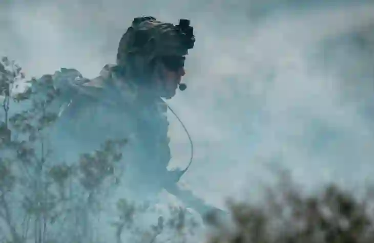 图:2023 年 3 月 8 日,在加利福尼亚州欧文堡国家训练中心举行的实弹演习中,一名隶属于第三步兵师第二装甲旅战斗队的士兵准备移动。(摄影:SPC Duke Edwards)