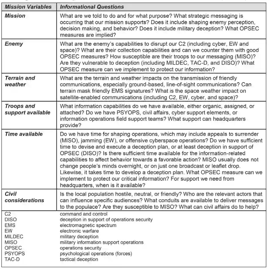 随着重点向 LSCO 转移,领导人经常强调,地面部队不能假定友军将始终拥有空中优势。这是正确的,但这只是 LSCO 如何改变动态的一个方面,因为领导者将无法确保信息优势。美国空军或陆军攻击航空兵可能无法参加连级战斗。而且,连长可能并不完全了解敌人的行动,也可能无法通过调频(FM)无线电呼叫预备队来反击敌人的攻击。将信息纳入对其他任务变量的分析,目的是让领导者思考自己所依赖的技术如何受到攻击和操纵,从而影响决策或限制选择,而且这种攻击和操纵可能以多种不同的形式出现。战术层面的条令未能充分说明战场是如何 "信息化 "的,以及敌人将如何利用地形和天气来发挥自己的优势、保护自己的弱点、利用美军的优势和削弱美军的优势。ATP 3-21.10 和 3-90.1 应在任务分析中考虑到这些因素。更好地理解信息如何影响行动的领导者更适合将 FM 3-0 中的行动要领纳入其中,并为如何利用信息帮助制定友军的作战行动方案奠定基础。