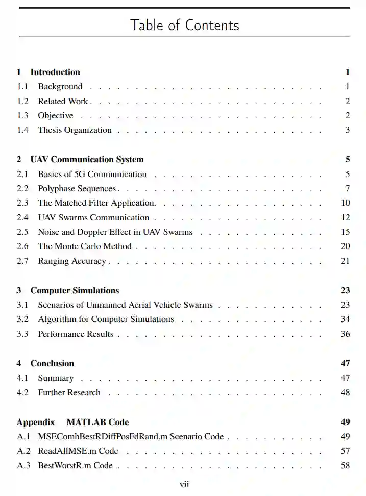 在第二章中,我们介绍了在模拟中应用的数学和方法的理论背景。这个数学和方法背景包括5G的基础知识和ZC序列的特殊性,以及交叉相关作为识别和测距部署在噪声和多普勒影响环境中的无人机群的一种手段的适用性。在第三章中,我们讨论了所模拟的场景及其算法,显示并解释了改变参数的原因,最后是性能结果以及它们是否显示了预期的结果。在第四章的结论中,我们对模拟结果进行了简要的总结和讨论,并提出了一些未来工作的想法。