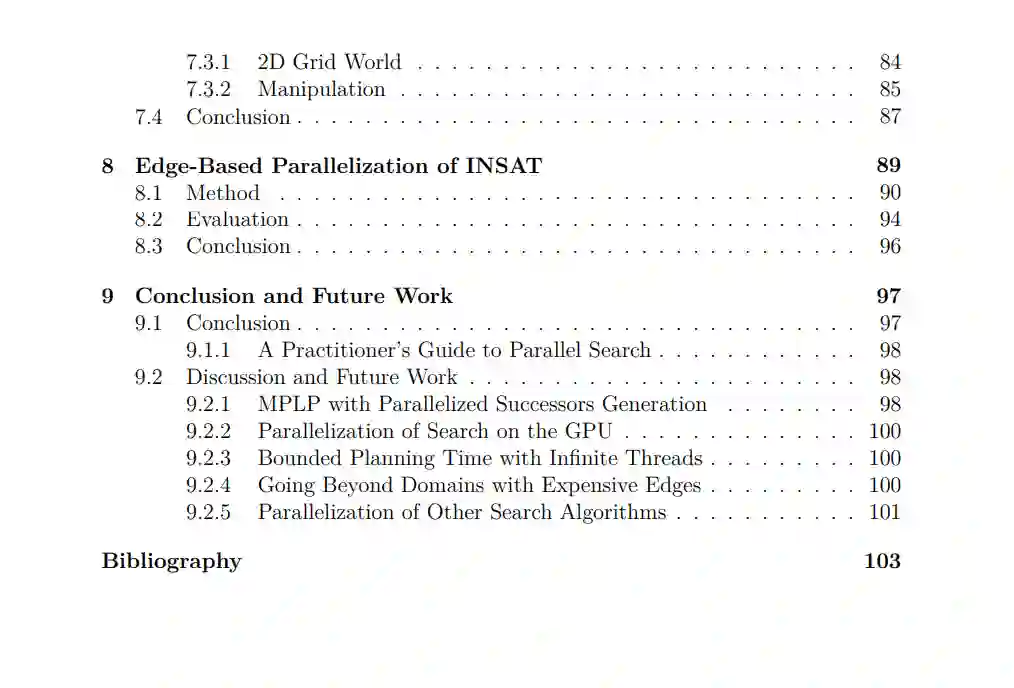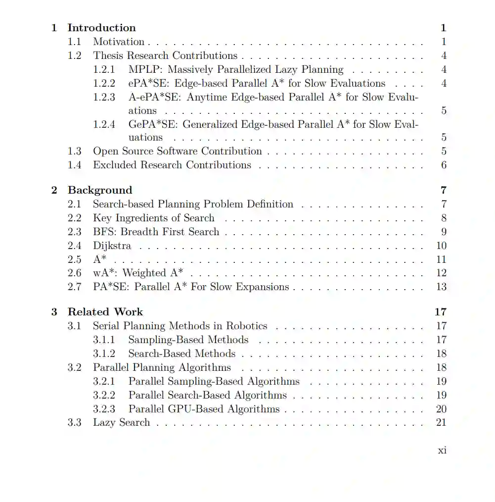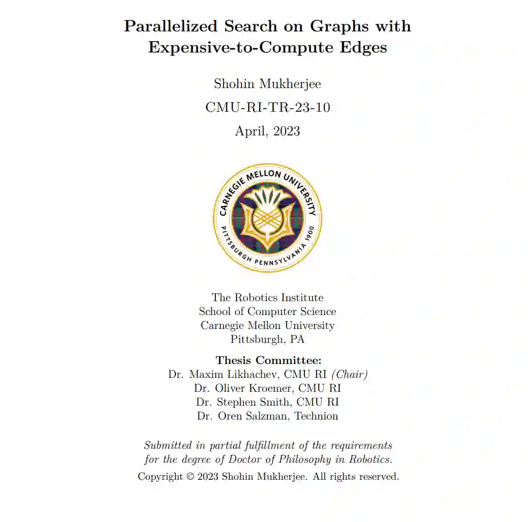 基于搜索的规划算法使得机器人能够为实现特定任务目标制定基于合理推理的长期规划。它们将问题表述为在域状态空间中嵌入的图上的最短路径问题。许多研究致力于实现更快的规划速度,以使机器人能够快速响应环境变化。此外,随着任务复杂性的增加,在规划过程中纳入更复杂的模型,如模拟器变得尤为重要。然而,这些复杂模型的计算代价高昂,严重降低了规划速度。由于CPU时钟速度的停滞,单线程规划算法的性能已达到了瓶颈。另一方面,CPU核心数量显著增长,这一趋势可能将继续。这就需要能够利用并行化的规划算法。然而,与基于采样的规划算法不同,由于其顺序性质,要保持最优性或有界次优性,对基于搜索的规划算法进行并行化并非易事。机器人领域的一个关键特征是,在规划过程中,大部分计算工作都花在计算动作的结果和产生的边的代价上,而非搜索图。在本论文中,我们利用这一见解,开发了几种能够利用现代处理器的多线程功能并行计算边的并行搜索规划算法。我们证明了这些新颖算法在多个领域大大提高了规划速度。我们的第一个贡献是一个并行化的懒惰搜索算法,大规模并行懒惰规划(MPLP)。现有的懒惰搜索算法旨在作为单个进程运行,并通过在搜索图和评估边之间智能平衡计算工作以实现更快的规划。MPLP利用的关键思想是,搜索图和评估边可以异步并行执行。在理论上,我们证明了MPLP具有完整性和有界次优性的严格保证。