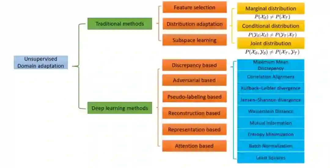 本文主要研究了图像识别中的域自适应问题。本次综述的贡献如下。(i)我们提出了一种基于传统和深度学习的DA分类方法。(ii) 我们是第一个在特征选择、分布适应和子空间学习三种不同背景下研究传统技术的人。(iii)我们还讨论了基于深度学习的方法,包括基于差异的方法、基于对抗的方法、基于伪标签的方法、基于重构的方法、基于表征的方法和基于注意力的方法。(4)我们收集了几个基准数据集,这些数据集在UDA中得到了广泛的应用,并报告了最新方法的结果。本文的其余部分组织如下:在第2、3节中,我们介绍了DA问题的符号和泛化界。在第四部分,我们回顾了传统的UDA方法。在第5节中,我们描述了用于图像识别的深度DA方法。在第6节中,我们列出了DA的基准数据集,并报告了最新方法的准确性。