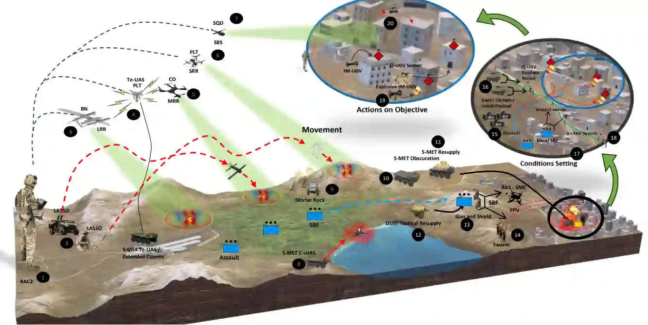 战术边缘的机器人机动:步兵装备的地面机器人自主系统(RAS)是传感器和射手分层网络的一部分,可为领导者提供远距离感知、探测和识别能力。这将增强对态势的感知,扩大决策空间,以精确地使用有机或更高级别的总部效应(致命和非致命)来塑造战场。“近距离摧毁 ”仍是轻步兵编队的基本要素。机器人机动提供了在轻步兵编队之外获得和保持接触的能力。