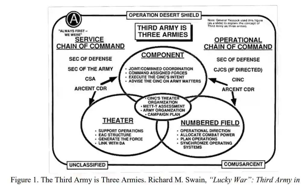 美国上一次使用野战军是在第二次世界大战期间,尽管在最近的 "伊拉克自由 "行动中也进行了大规模作战行动(LSCO)。野战军不再使用和条令的过渡是一个渐进的过程,其结果是在 "沙漠风暴 "行动和 "伊拉克自由 "行动期间,由一个总部承担三种不同的角色。