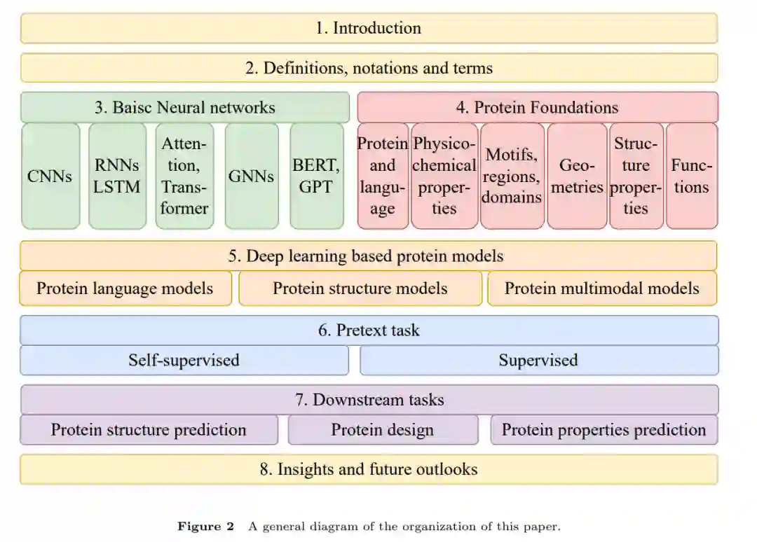 在以下部分中,我们提供了定义、常用术语和解释了在蛋白质研究中使用的各种深度学习架构。这些架构包括卷积神经网络(CNN)、循环神经网络(RNN)、变压器模型和图神经网络(GNN)。尽管深度学习模型在蛋白质研究领域的应用日益增加,但仍需要对这个快速发展的领域进行系统总结。现有的与蛋白质研究相关的综述主要关注生物学应用[25-27],而没有更深入地探讨其他重要方面,例如比较不同的预训练蛋白质模型。我们探讨了这些架构如何被适应用作蛋白质模型,总结并对比了用于学习蛋白质序列、结构和功能的模型架构。此外,还讨论了为蛋白质相关任务优化的模型,例如PSP、蛋白质-蛋白质相互作用(PPI)预测和蛋白质性质预测,突出显示了它们的创新和差异。此外,还提供了一系列资源,包括深度蛋白质方法、预训练数据库和论文列表[1][2]。最后,本综述介绍了现有方法的局限性和未解决的问题,并提出了可能的未来研究方向。图2展示了本文组织的概览。