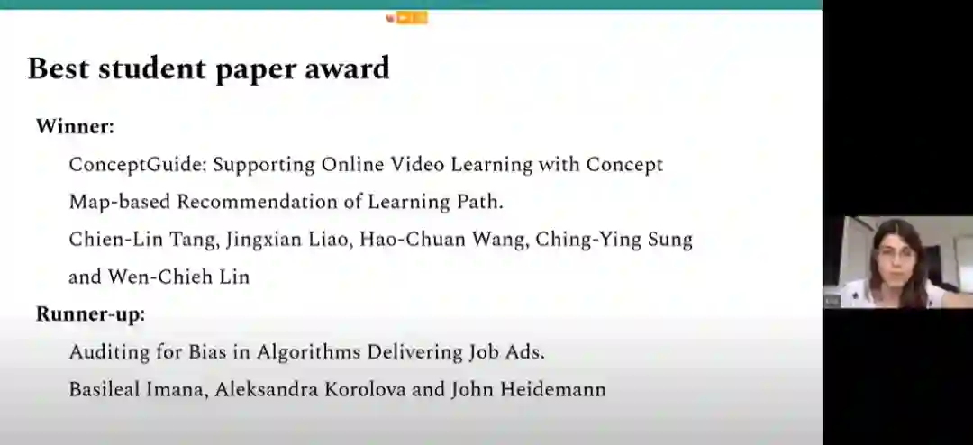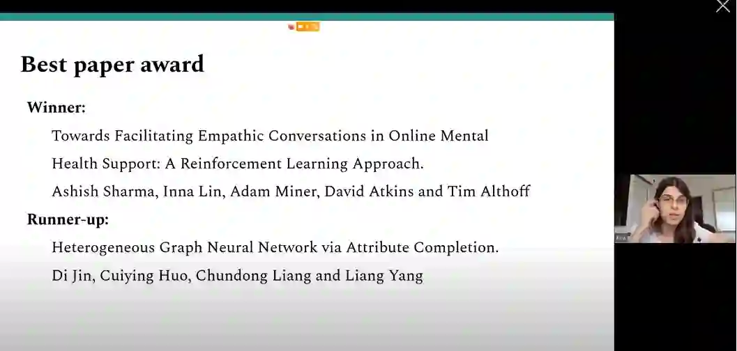【导读】2021年国际万维网大会The Web Conference(旧称WWW)将于2021年4月19日-23日线上召开。TheWebConf是中国计算机学会(CCF)推荐的A类国际学术会议,是互联网技术领域最重要的国际会议之一,由国际万维网会议委员会(IW3C2)和主办地地方团队合作组织,每年召开一次,今年是第30届会议。本次会议共接收1736篇提交长文,最终录用357篇,录用率为20.6%。刚刚最佳论文一系列奖项出炉了!来自华盛顿大学的强化学习在线心理健康应用《 Towards Facilitating Empathic Conversations in Online Mental Health Support: A Reinforcement Learning Approach》获得最佳论文,台湾国立交通大学《ConceptGuide: Supporting Online Video Learning with Concept Map-based Recommendation of Learning Path》获得最佳学生论文!