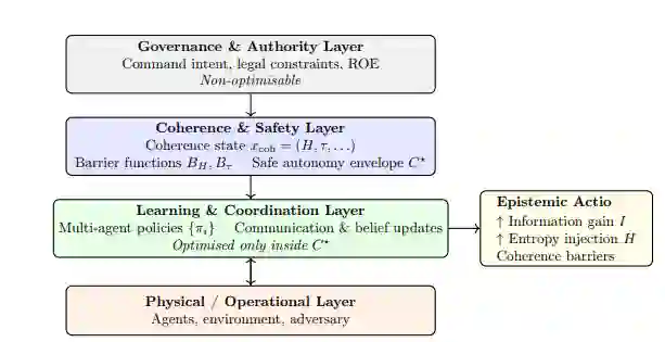 图1:分布式军事人工智能的治理架构。 分布式智能被建模为一个分层动力系统,其中强化学习仅在协调安全自主边界 C⋆ 内运行。治理与权限定义了容许的状态和行动,但并非优化目标。协调被视为一个由障碍函数和不变性条件约束的安全关键状态变量。每当提议的更新会违反协调或信任边界时,学习与协调过程都会被映射回 C⋆ 内。通信是一种认知性行动,它同时增加信增益并引入熵,从而将学习动力学与协调保持相耦合。因此,自主性是状态依赖的,而非二元的。
