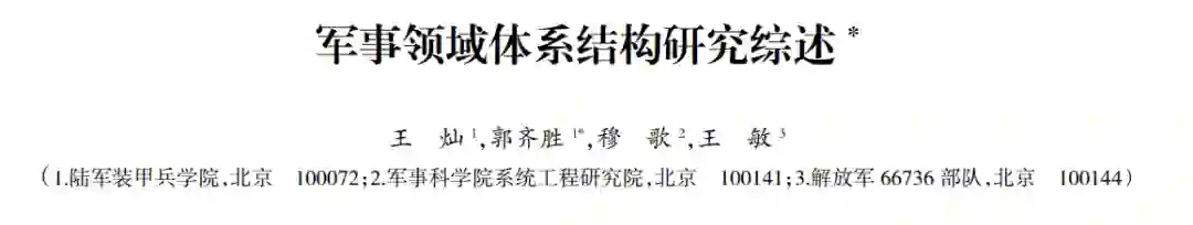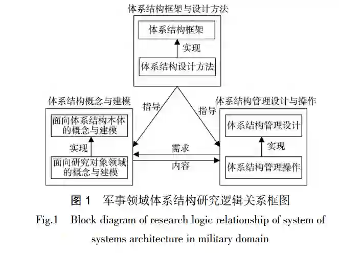 军事领域体系结构研究已经历 20 余年,对于促进军事领域体系建设发挥了重要作用。通过文献分析识 别出军事领域体系结构研究的 3 个主要方向,即体系结构框架与设计方法、体系结构概念与建模、体系结构管理设计 与操作,对每个方向的主要内容和研究进展进行了综述,综合相关研究情况,提出下一步的研究建议。 现代战争强调体系对抗,加强体系建设是军事 领域的重要课题。自 20 世纪 90 年代美国国防部推 出 C4ISR 体系结构框架后,体系结构方法论在军事 领域的研究与应用已经历了 20 余年的历程,在军 事体系的需求与设计、集成与构建、演化与评价中 发挥了重要作用,正得到越来越多的关注。军事领域体系结构研究与其他领域在研究内 容、技术上既有共性也有特性,既包含体系结构基 础理论探索,也包含大量方法研究和应用实践。Aier 等在分析国外大量体系结构文献的基础上,按照研 究内容把体系结构研究划分为体系结构理解、体系 结构表达、体系结构使用 3 个方面[1]。Simon 等通过 文献分析,把体系结构研究划分为体系结构框架、 体系结构概念与建模、体系结构管理设计与操作 3个方面[2]。高松等从关键技术角度划分为体系结构 框架、体系结构设计方法及工具、体系结构综合评 估方法 3 个方面[3]。本文综合上述划分方式,通过 文献分析识别出 3 个主要研究方向,即体系结构框 架与设计方法、体系结构概念与建模、体系结构管 理设计与操作,并建立了逻辑关系框图,如图 1 所 示。以下分别对 3 个方向研究进行综述,进而得出 下一步的研究建议。