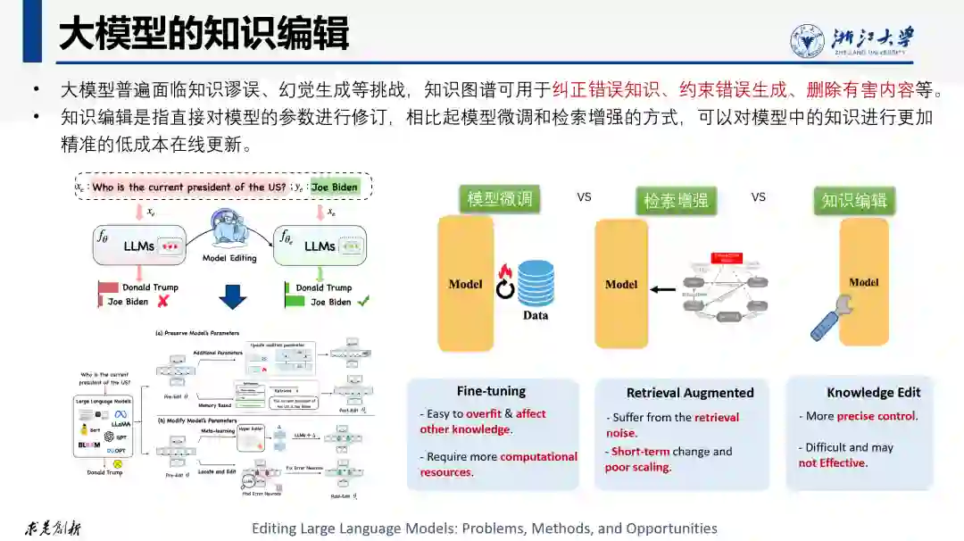 大模型的一个众所周知的问题是幻觉与知识谬误问题。由于模型给出的答案是从神经网络中通过参数的组合生成出来,而非从确定的文本内容检索出来,一旦模型出错,既不容易定位错误的来源,也不易于对参数化的知识进行更新。更为困难是知识参数化之后,彼此高度关联,改动一条知识更容易出现“牵一发动全身”的后果。 幻觉、出错以及不确切的回答是大模型智能得以涌现所需要付出的代价,同时也是大模型得以实际应用必须要客服的技术挑战。模型编辑技术实现在神经网络空间对参数化的知识进行增删改,以纠正错误的知识,删除有害的知识和约束错误的生成。但在极大规模的参数空间对知识进行编辑并不是件简单的工作,这首先需要在神经网络中定位错误的知识,确定修改的边界,更新参数的机制和方式等。由于神经网络的参数之间是高度关联的,改动其中任何一个神经元都会对与之相关的其他神经元产生“牵一发动全身”的影响。更改其中一条知识需要充分考虑知识之间的逻辑依赖关系。可以利用符号化知识图谱中显式定义的事实之间的关系,来辅助确定参数化知识之间的关联关系并确定参数更新的边界。 更一般而言,由于知识图谱中的知识很多都经过人工审核和校验,相对标准和正确,因而可以为矫正模型的对齐目标。例如可以利用知识图谱为奖励模型提供反馈信号,通过将大模型返回的结果与知识图谱中的事实、关联或约束进行比较,以提供反馈信号来改进生成的结果或衡量模型的性能。因此,定义良好的知识图谱可以作为矫正大模型的对齐目标。