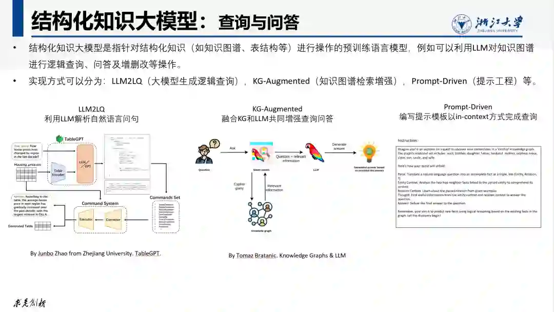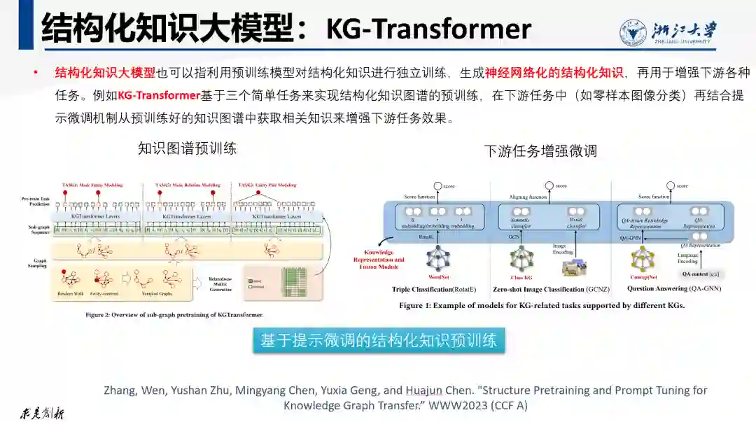 结构化知识大模型也可以指利用预训练模型对结构化知识进行独立训练,生成神经网络化的结构化知识,再用于增强下游各种任务。例如KG-Transformer基于三个简单任务来实现结构化知识图谱的预训练,在下游任务中(如零样本图像分类)再结合提示微调机制从预训练好的知识图谱中获取相关知识来增强下游任务效果。 一些研究表明,现有大模型在处理天然依赖结构化数据的任务方面,除查询问答类因为依赖自然语言生成结构化查询表现较好以外,其他例如链接预测、关联挖掘、子图分析、时序预测等任务仍然无法超过传统小模型。但大模型的知识预先训练、指令驱动的泛化能力、奖励模型与对齐学习等思想均可用来增强结构化知识的处理能力。我们可以通过设计更加适合编码结构化知识的基础模型训练机制、通过将结构化数据指令化实现指令驱动的结构化任务处理、面向结构化数据任务的奖励模型等,提高大模型分析和处理结构化知识的能力,这对于很多依赖结构化数据的大数据分析类应用领域具有重要价值。