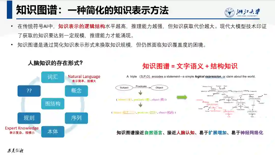 自然语言以文字序列的方式来表示知识,而知识图谱(KG)利用图结构来描述世界万物之间的关系,代表一类结构化的知识表示方法。典型结构表示包括:层次结构(如概念图谱)、关联结构(实体关系图谱)、时序结构(如事理图谱)、逻辑结构(如逻辑规则)等。知识图谱中既包含自然的文字语义,也包含结构化关联关系。但人脑中的知识显然没有文字序列和图结构那么简单。在传统符号AI的研究中,知识表示的逻辑结构与推理机的推理能力有着密切的关系。简单的词汇或概念组成的自然语言序列通常被认为不利于机器进行推理计算,而具有层次结构的Taxonomy、更为复杂的本体结构Ontology以及规则逻辑则更加利于实现可靠的机器推理。正如后文分析,即使在基于文本预训练实现的大模型推理时代,这种知识表示的结构化水平与模型推理能力之间的正关联关系是仍然存在的。