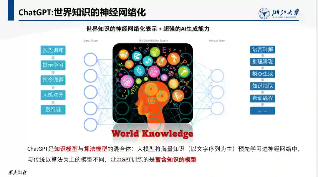 人们在认识世界的过程中不断积累关于世界的知识,而语言则是表示世界知识的最直接载体。目前为止,人类的绝大部分知识都是通过自然语言来描述、记录和传承的。除了记录常识知识的自然语言,人类还发明了描述数学模型的数学语言,描述分子结构的化学语言(如SMILE),描述生命体组成的基因语言等来表示和记录更为专业的专家知识。以ChatGPT为代表大型语言模型将这种海量的、以序列为主的世界知识预先学习进神经网络中,并实现在参数化空间对知识进行处理和操作。与传统以算法为主的模型不同,ChatGPT训练的是富含知识的模型,是知识模型与算法模型的混合体。