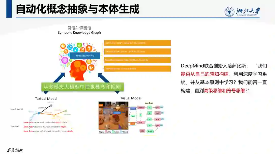 知识图谱的本质是建模关于世界的概念抽象,也就是本体Ontology。人大脑中的Ontology是在人认识世界万物过程中,通过归纳和抽象形成的关于世界万物的概念、类别、属性、关系以及它们的层次体系。大型语言模型从海量的文字语料中学习到丰富的有关字词及概念的知识,因而对概念的识别、理解、抽象能力表现突出。这为自动化的概念层次构建、类目扩展、属性补齐、本体对齐、概念归一化及更新处理提供了更强有力的技术手段。 DeepMind联合创始人哈萨比斯曾经提到: “我们能否从自己的感知构建,利用深度学习系统,并从基本原则中学习?我们能否一直构建,直到高级思维和符号思维?”。当前的大型语言模型仍然是从人类所产生的文本语料库中萃取和学习关于世界的知识。未来的大模型是否可以更多直接从与客观世界的感知交互过程中,依靠模型本身来总结关于世界的知识,抽象出关于世界的概念和本体,并直接用于决策或问答。 小结一下,在传统的知识图谱技术栈中,大模型也能在多个环节发挥作用,例如在知识图谱的构建阶段,指令驱动的知识图谱构建可以实现泛化能力更强的知识抽取,而大模型的见多识广有望帮助我们实现更加自动化的本体与概念抽象。通过构建结构化知识大模型可以利用大模型的语言理解能力大幅提升对结构化知识的查询、问答与更新等操作,而大模型的常识语言推理能力也可以与知识图谱的符号推理能力形成互补,相互增强。