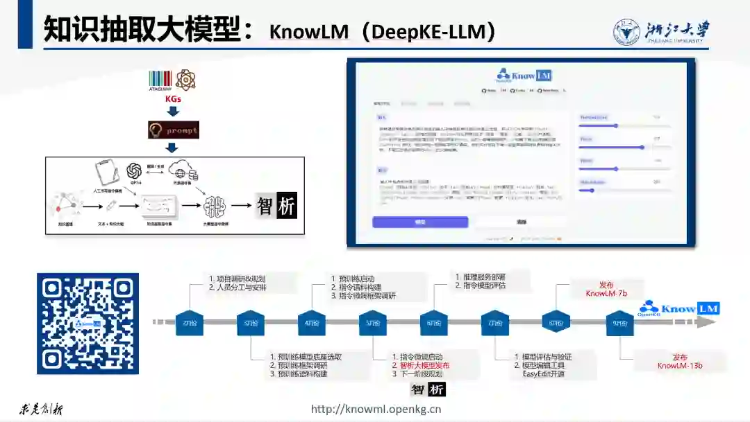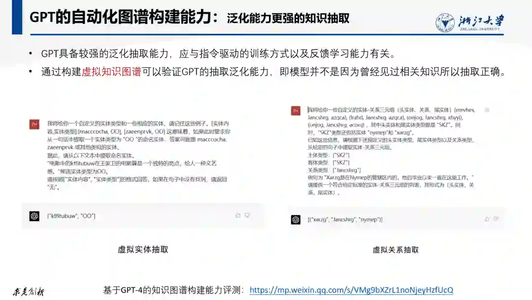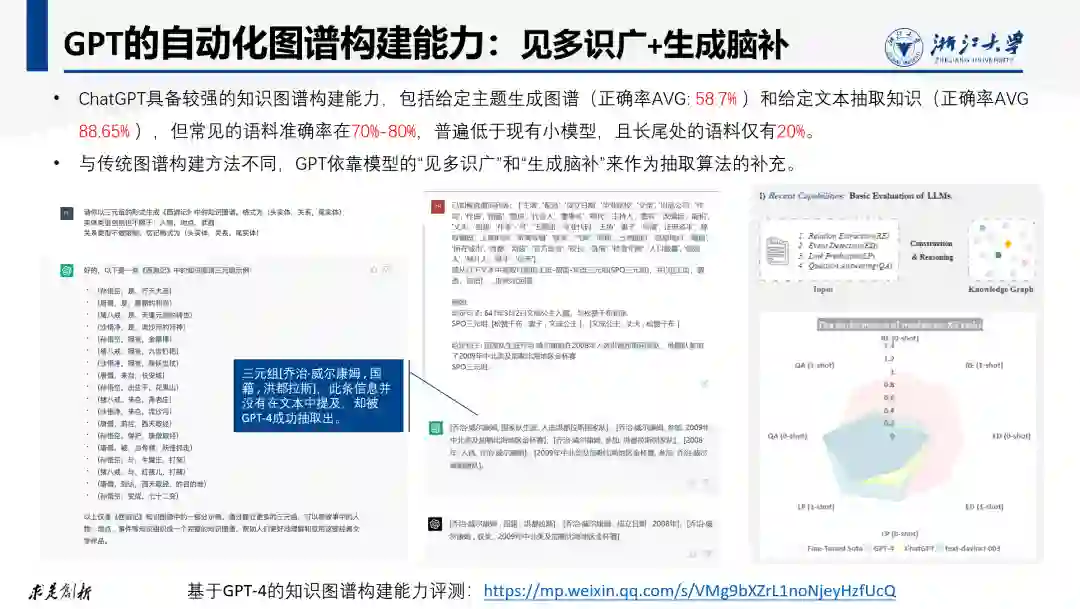 大家所普遍关心的首先是大模型的自动化知识图谱构建能力。对此,我们对GPT4的图谱构建和抽取能力进行了深入评测,详细评测报告可参见PPT中给出的评测报告链接。经过评测,ChatGPT的确具备较强的知识图谱构建能力,包括给定主题(如:浙江大学)生成对应的知识图谱,但由于GPT极大依赖生成模型来生成知识图谱,其幻觉问题导致生成的知识图谱的正确率在我们给定的测试集中平均只有 58%。 如果给定文本要求GPT按要求抽取知识,其正确率平均可以达到88% ,但仍然低于现有小模型的SOTA。更为广泛的评测发现ChatGPT对于常见的语料准确率在给定测试集中大部分在70%-80%,且长尾处的语料仅有20%。 需要特别指出的是,与传统图谱构建方法不同,GPT依靠模型的“见多识广”和“生成脑补”来作为抽取算法的补充。即它会从模型参数中提取知识或直接生成一些知识来补充抽取结果,尽管结果中的一些知识并没有出现在待抽取的文本中。 为了验证GPT并非完全是因为曾经见过相关知识(即训练语料中有相关知识)所以抽取正确,我们设计了一个虚假知识图谱,即让机器随机生成一些毫无意义的虚假实体和虚假关系,确保模型不可能在训练语料中见过这些实体或关系类型,再生成一些包含这些虚假实体和关系的文本,然后通过指令要求GPT从这些文本中抽取出对应的实体和关系。实验结果表明GPT仍然能够较为准确的实现抽取。这说明GPT具备较强的泛化抽取能力,这应该与指令驱动的训练方式以及GPT的反馈学习训练过程有关。因此发展指令驱动的知识图谱构建和知识抽取技术是有重要价值和意义的。