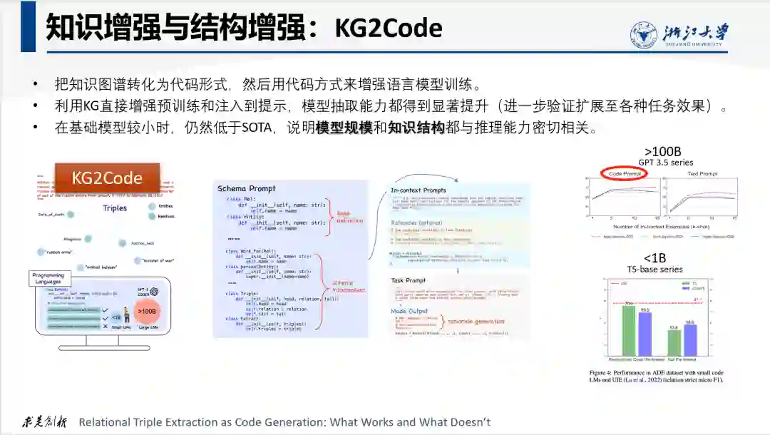 代码语言并不适合描述常识知识和完成常识推理,而知识图谱可用于描述常识知识。为进一步探讨知识结构对于常识推理的影响,我们尝试将KG中的结构化知识转化为对应的代码形式:例如KG中的类对应面向对象代码中的类,KG中的属性和关系转化为对应的成员变量。然后以这种代码形式的KG作为Prompt或者直接在Base模型预训练阶段进行注入,来测试其对下游任务的影响。实验结果表明,注入有知识图谱结构的模型在多个方面的能力得到提升,特别是在抽取任务方面得到显著提升。但在模型整体规模较小时,其能力仍然低于SOTA,说明模型规模和知识结构性都与推理能力都密切相关。