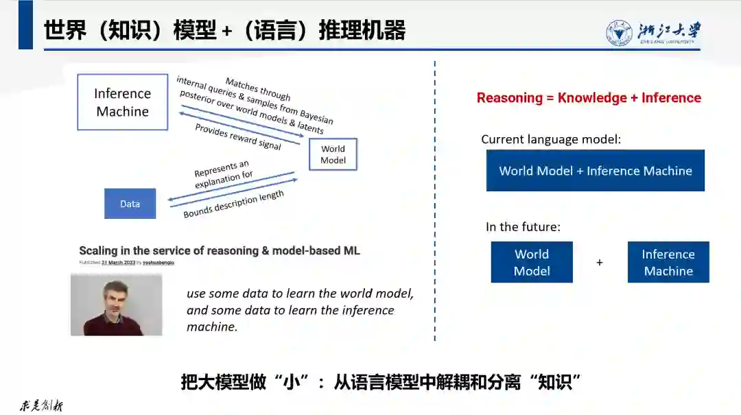 大模型“大”的本质原因是它需要大量的参数来表征海量的世界知识。正如Bengio在其最近一篇博文中所指出,当前大模型中的参数实际上包含两部分:世界模型(World Model)和推理机器(Inference Machine)。世界模型用于存储世界知识:事实上,大模型中的大部分神经网络参数都是用来存储知识的。而用来进行推理计算的推理机器是依靠语言模型来实现。或许是因为人的知识推理也极大的依赖语言理解能力和过程,在大模型中“语言”和“知识”也是浑然一体密不可分的。这和传统符号AI的实现是很不一样的,在传统符号AI如专家系统架构中,知识库和推理引擎是两个独立实现的模块。但Bengio也同时指出,未来的大模型或许应该将世界模型和推理机器进行适当解耦,这样存储知识的部分可以独立进行验证和维护,这或许是控制模型规模和提高模型知识的可验证性和可靠性的一条可能路径。