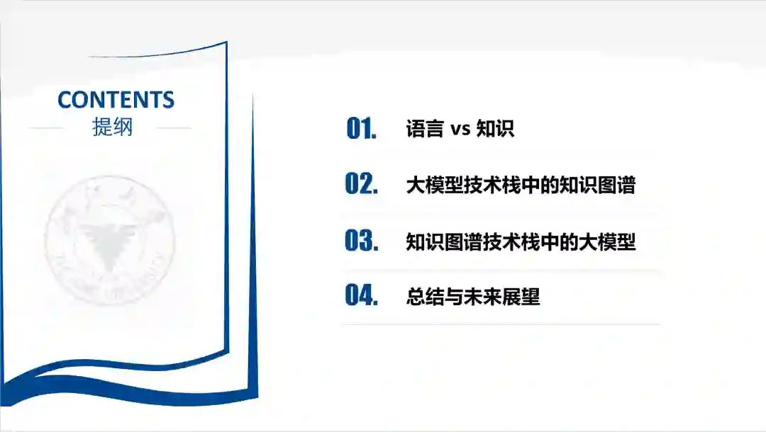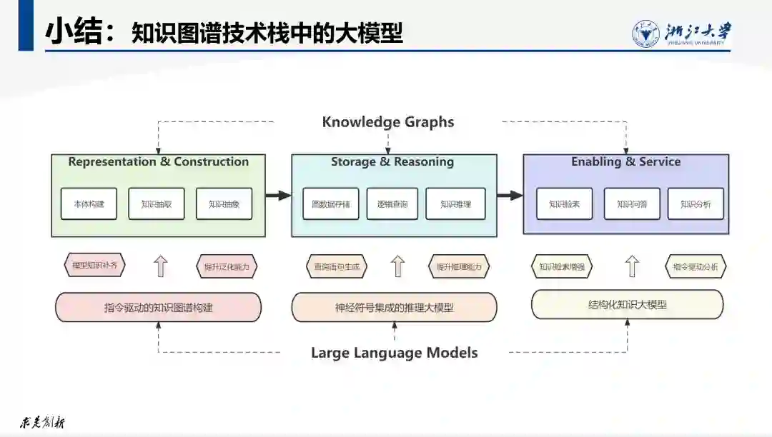 总结与展望最后我们从三个视角做一个总结:● “语言” vs “知识”:语言和知识密不可分,语言模型与知识图谱都是用来处理世界知识的手段。以ChatGPT为代表的大型语言模型技术的发展代表人工智能表示和处理知识能力的大幅提升。● “新KG”技术栈:在大模型时代,知识图谱不是没有用了,而是更加重要了,可以预见随着语言模型与知识图谱的深层次融合,一个全新的知识图谱技术栈会逐步演进和形成。● 从“LLM”到“LKM”:人类知识高度复杂,很多知识是无法用自然语言序列来表示和描述的。我们在刻画客观世界时,更多采用的是多样化的结构化描述。大型语言模型只是起点,我们最终需要发展的是能够大规模编码和处理各种知识表示结构的大型知识模型(Large Knowledge Model)。 知识的表示与处理是人工智能自诞生以来的核心目标之一,而作为同样用来处理知识的大型语言模型和知识图谱各有优缺点。大模型补足了理解语言的能力,知识图谱则丰富了表示知识的方式,两者的深度结合必将为人工智能提供更为全面、可靠、可控的知识处理方法。