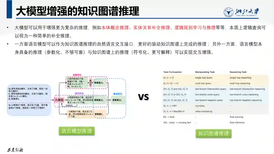 常见的知识图谱推理方法一般可以分为基于符号表示的推理和基于嵌入或图表示学习的神经网络推理两种方法。符号方法基于显示知识,推理过程明确可解释,答案确定,但泛化能力差;神经网络方法基于隐式知识,推理泛化能力更好,但不能给出确定答案。因此,研究人员发展出将两类方法相结合的神经符号集成的推理方法。大型语言模型把自然语言形式的符号知识参数化,也是一种在神经网络空间实现的推理。但与传统图神经网络、知识图谱嵌入等推理方法不同,大模型还依靠“见多识广”的知识丰富性和“模型脑补”的生成能力来增强推理的完备性和更强的泛化能力。因此,大型语言模型可以和传统符号知识图谱推理方法形成更好的互补。例如,一方面,大模型可以将符号知识图谱作为外部可调用的工具,在需要确定答案时,利用符号知识图谱的推理来给出更加可靠、明确和确定的答案。另一方面,在符号知识图谱推理因为知识缺乏而推不出答案时,可以利用大模型的见多识广和高泛化能力来给出粗粒度的推理。
