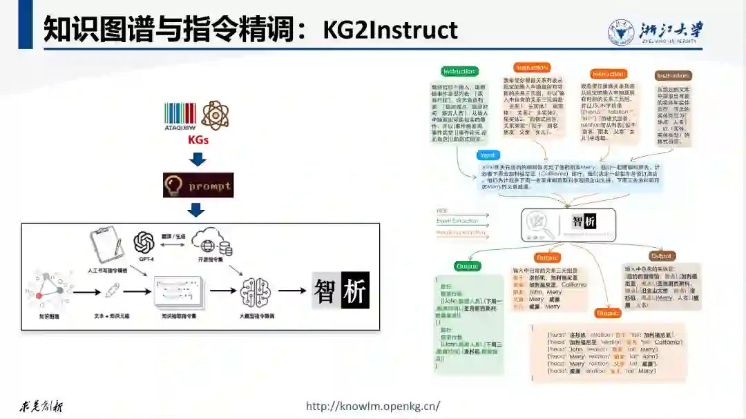 指令精调是指在预训练模型的基础之上,通过将任务特定的监督数据转化为指令或提示形式,进一步训练和微调以提升模型的性能和准确性。由于各种不同任务的数据都以统一的指令形式输入到模型进行训练,这使得模型具有更好的任务泛化能力,即解决新问题或完成新任务的能力。知识图谱中的知识可用来增强指令提示或直接用于生成指令数据集。例如,知识图谱中的实体属性和关联信息可以用于丰富指令的上下文信息。通过查询知识图谱,可以获取实体之间的关联和属性,并作为提示工程的一部分。 下图展示了一个利用知识图谱直接构建知识抽取指令的例子。该模型基于KG2Instructions技术产生的大量指令数据来提高语言模型对于人类抽取指令的理解。具体基于维基百科和WikiData知识图谱,通过远程监督、Schema约束过滤等方法构建大量的指令数据,并通过随机采样人工指令模板的方式提升指令的泛化性。