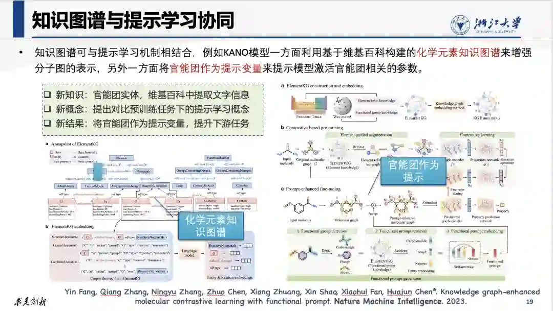 知识图谱可与提示学习机制相结合。下面这篇工作是我们团队今年发表在Nature机器智能子刊上的文章:“Knowledge graph-enhanced molecular contrastive learning with functional prompt.”。文中介绍的KANO模型一方面利用基于维基百科构建的化学元素知识图谱来增强分子图的表示,另外一方面将官能团作为提示变量来提示模型激活官能团相关的参数。