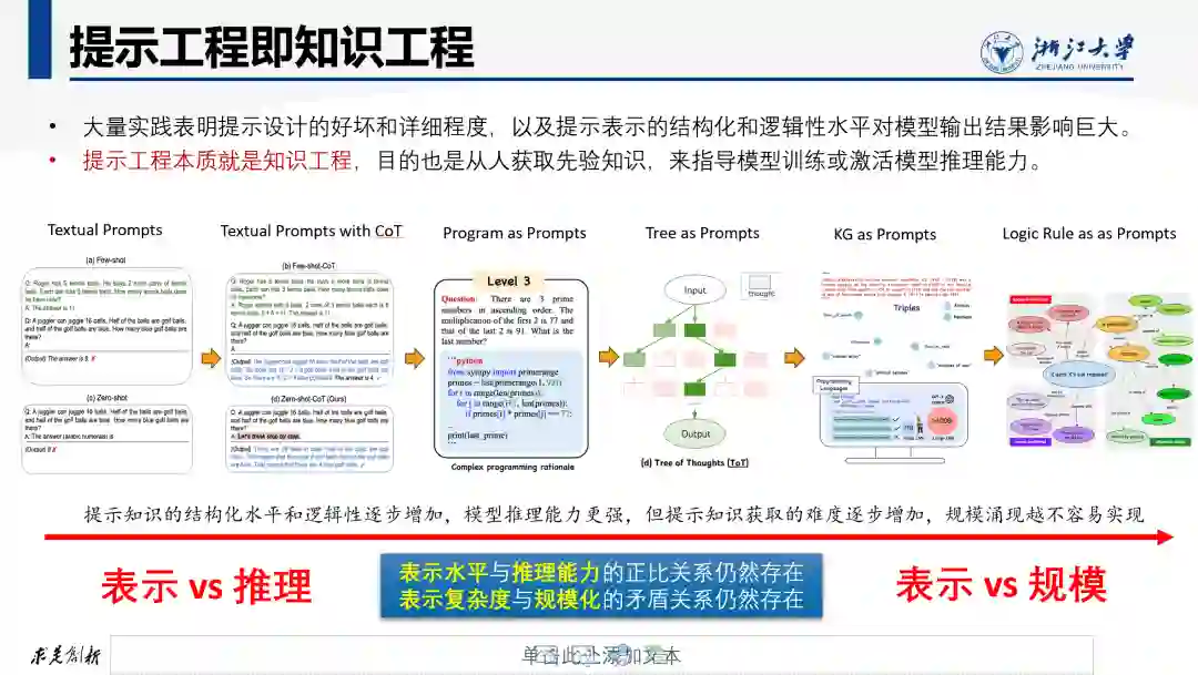 提示(Prompts)是指在训练或使用大模型时使用的一类引导性指令,如问题描述、上下文信息、举例示例、结构模板、思维链等。通过提供明确的提示或指令,模型可以更好的理解人的意图和要求,产生更加遵循人类指令要求的输出。事实上,大模型所体现出的“智能”很大程度上是由提示工程阶段所植入的知识所驱动的。 大量实践表明,提示设计的好坏和详细程度对模型输出结果影响巨大。在预训练阶段所使用的诸如“Next Token Prediction”的监督信号仅能编码基础的、通用的、浅层的语义和知识。而“提示”则包含有大量任务特定的知识,这些知识不只是描述人的意图和问题指令,还可能包括人的思维逻辑(如思维链)、类比逻辑(如举例示例)、与任务相关的实体及关联关系等事实性上下文信息等。特别是在模型微调训练阶段,大量以提示或指令形式存在的先验知识被编码进大模型,大幅提升语言模型的回答复杂问题和逻辑推理的能力。 提示工程本质就是知识工程。越来越多的研究表明提示知识的结构化和逻辑性,与模型推理能力密切相关。从最简单的文本提示(Textual Prompt)和带思维链的文本提示(CoT),到代码提示(Program of Thoughts)、树型提示(Tree of Thoughts)、图提示(KG of Thoughts)等结构化更强的提示,甚至直接以逻辑规则作为提示,随着提示知识表示水平的提升,模型推理能力可以得到提升。但推理能力的另外一个重要因素——规模涌现,又与提示知识表示水平相矛盾:表示水平越高,提示知识获取难度越高,模型的规模涌现越不容易实现。因此,在大模型时代,知识表示水平与推理能力的正比关系仍然存在,而表示复杂度与模型规模化的矛盾关系也依然存在。构建和获取高质量的提示语料(即提示工程)本质上就是获取人类先验知识过程,这和传统知识工程的目的本质上是相似的。高质量的提示工程和传统知识工程一样,也是耗时费力的。