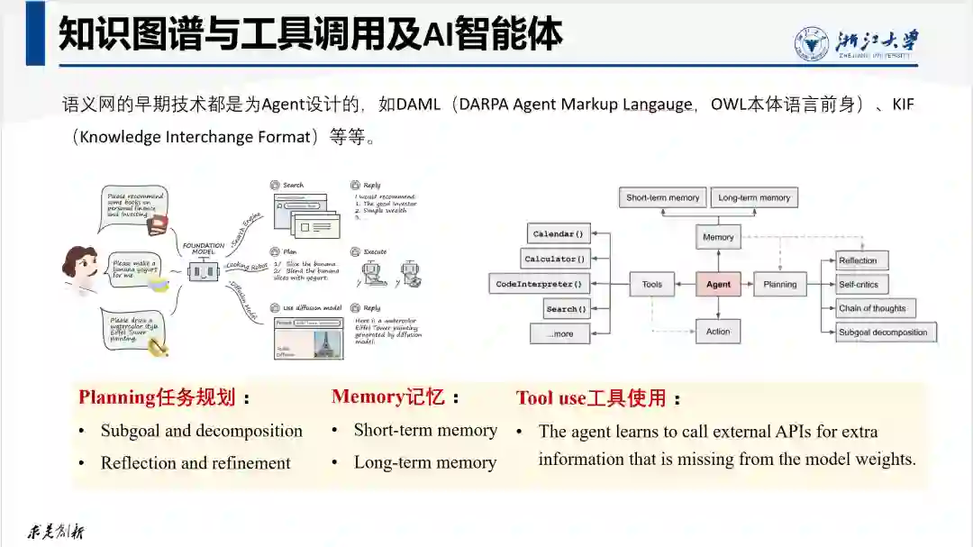 工具增强的语言模型(Tool-Augmented Language Model)在模型自身无法解决问题时可以调用外部工具来完成。这些工具可以是数学计算器、数据库访问接口、特定功能API等。一个复杂的任务可能需要组合调用多个工具,形成复杂的工具调用逻辑结构。大模型要自主的学习这种复杂的工具调用逻辑仍然是有困难的,而知识图谱可用于复杂API组合调用逻辑的建模中,这在传统服务计算架构领域已经有很多这方面的实践。更一般化的工具调用是AI智能体之间的智能交互,即:Agent之间互为工具,在某个Agent自己无法完成特定任务时,将会向外寻求其他多智能体的协作和帮助。知识图谱和多智能体有着深刻的历史渊源。早期知识图谱技术如RDF/OWL等设计的本意是为了便于互联网多智能体Agent进行知识获取,并作为Agents之间的知识交换格式(Knowledge Interchange Format)。例如OWL语言的前身之一DAML正是Agent Markup Langauge的缩写。语言模型技术的成熟为多智能体之间进行知识交换和知识交互提供了新的方式。工具增强的大模型可以帮助Agent自主的学习其他Agent的调用和交互方式,在自己的知识无法解决当前问题时,自主的去寻找其他Agents的协助,并且无需基于由人工定义的知识交换接口。这使得Agent之间能更加自主的实现知识协同,建立更加强大的智能体协作社区。