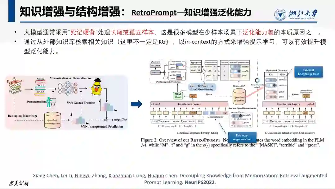 外部知识还可以增强大模型的泛化能力。我们在NeuralPS2022上发表的一个工作——RetroPrompt就是探讨这个问题。大模型通常采用“死记硬背”处理长尾或孤立样本,而不是真正学习到样本中的规律,这是很多模型在少样本场景下泛化能力差的本质原因之一。这就好比一个只知道死记硬背的学生举一反三的能力就比较弱。RetroPrompt通过将知识与记忆解耦,即单独训练一个知识库(这里不一定是KG),然后通过从这个知识库检索相关知识,以in-context的方式来增强提示学习,可以有效提升模型在少样本场景下的泛化能力。