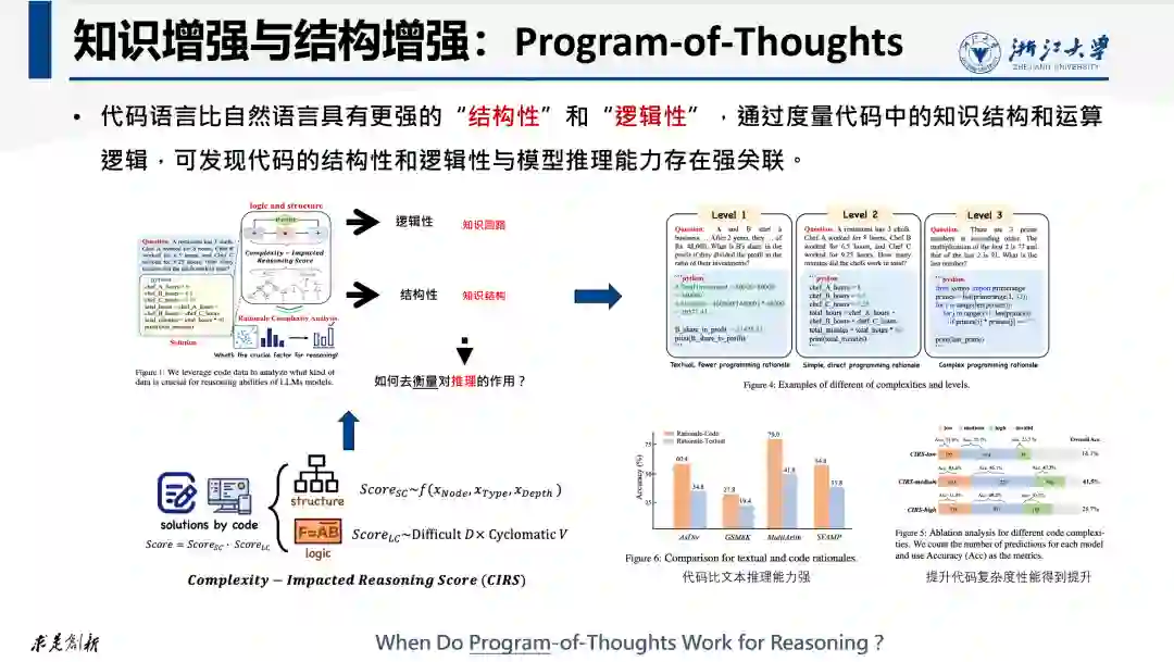 为进一步探索代码结构与推理能力之间的关联关系,我们开展了一项“Program of Thoughts”的研究工作。我们首先定义了一些衡量代码结构性和逻辑性的指标,以此来衡量不同形式代码中的结构性知识的丰富程度。例如,一个包含复杂循环逻辑的代码比简单的变量赋值包含更丰富的运算逻辑,因此其结构性和逻辑性得分更高。然后我们把这些结构性不同的代码作为prompt来驱动模型的问答,并对其推理结论的正确性比例进行分析。在多个测试数据集上的实验分析表明,结构性和逻辑性更强的代码提示更加有助于激活模型的推理能力。