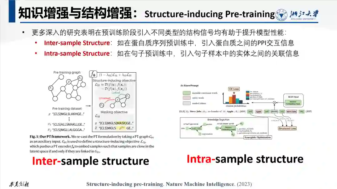 我们再从样本Sample的视角讨论一下结构增强。这项称为“Structure-inducing Pretraining”的研究探讨了建立训练样之间的结构化关联关系对于提升模型性能的作用。在该文中,作者综述了当前预训练模型对于样本结构信号的利用情况,并指出大部分模型在这方面考虑不足。并进一步从理论分析和实验验证系统性分析了在模型训练阶段注入结构信号的价值。这些结构信号包括:Inter-sample Structure(如在蛋白质序列预训练中,引入蛋白质之间的PPI交互信息)和Intra-sample Structure(如在句子预训练中,引入句子样本中的实体之间的关联信息)。
