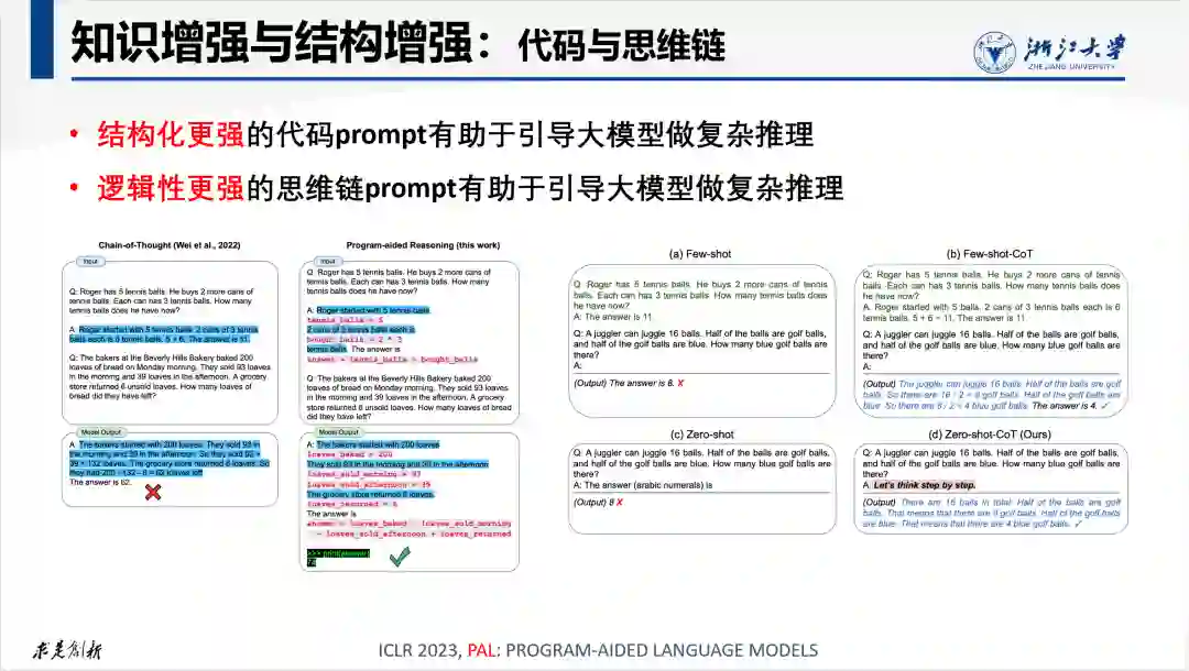 越来越多的研究表明,不论是在预训练阶段还是在指令提示阶段,提升语料的语义规范性或数据的结构化水平均有助于增强模型推理能力。例如,代码语言比之自然语言结构化更好,同时其中包含大量的运算逻辑,不仅可以实现代码生成能力,也更利于激活模型推理能力。思维链比之普通的自由文本包含更多的逻辑关联性描述,因而更有利于提升模型推理能力。进一步研究表明思维链在模型规模到一定程度(>100B)才能诱发思维链推理能力,这可以解释为更大规模的模型蕴含更多用于推理的隐式知识,而这些知识的激活则需要逻辑性更强的提示。