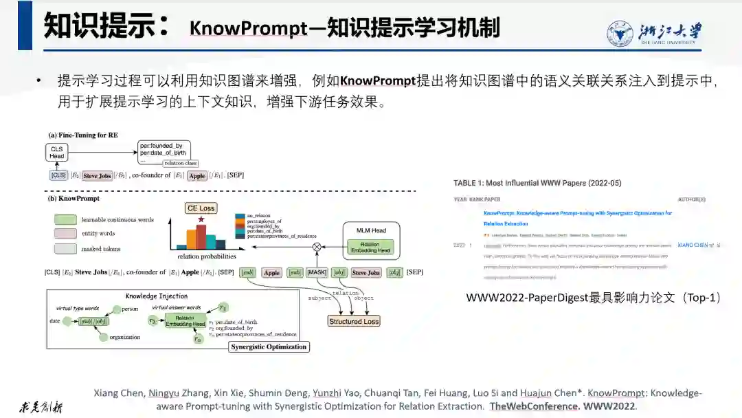 知识图谱中的知识是可以用来增强提示学习过程的。例如,我们在WWW2022发表的一个工作KnowPrompt就提出将知识图谱中的语义关联关系注入到提示中,用于扩展提示学习的上下文知识,实验表明,注入知识后的提示能更好激活模型能力,增强下游任务效果。该工作也是WWW2022-PaperDigest的最具影响力论文。
