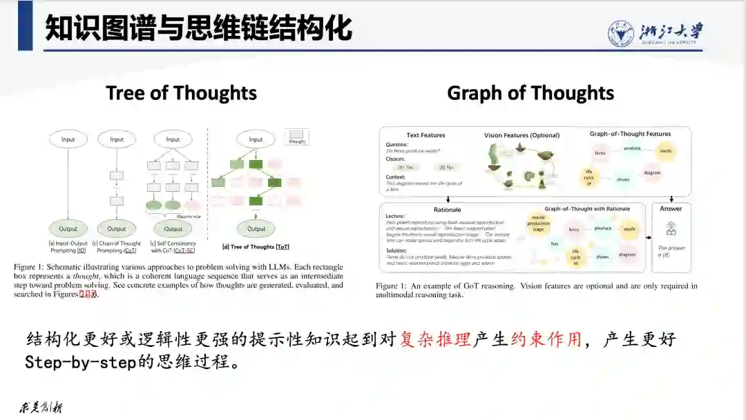 关于提示学习中的思维链CoT(Chain of Thoughts)还可以单独再深入探讨一下。思维链是一类特殊的提示,它模拟了人们在思考和解决问题时,通过联想将不同的概念或知识关联起来的过程,从而引导大模型模仿人的逻辑思维过程。显然知识图谱是表示和生成思维链的好帮手。前面已经谈到,采用结构化更好的思维链表示形式(如Tree of Thoughts,Graph of Thoughts等)比之自然语言形式的思维链更有利于诱导出大模型的推理能力。 一方面,人们可以按自己的兴趣和要求,将不同的概念和思维步骤关联起来,形成逻辑更加清晰的思维链知识图谱(KGoT),这种结构化的思维链可以直接作为提示的一部分输入到模型中,也可以利用KG2Text自动化生产所需的自然语言形式的思维链,再注入到模型中。另外一方面,知识图谱中的概念和实体提供了丰富的知识关联,通过实体链接技术与手工编写的思维链进行关联,可以便利的扩展和增强自然语言形式的思维链,使得思维链更加接近于人的联想思维模式。