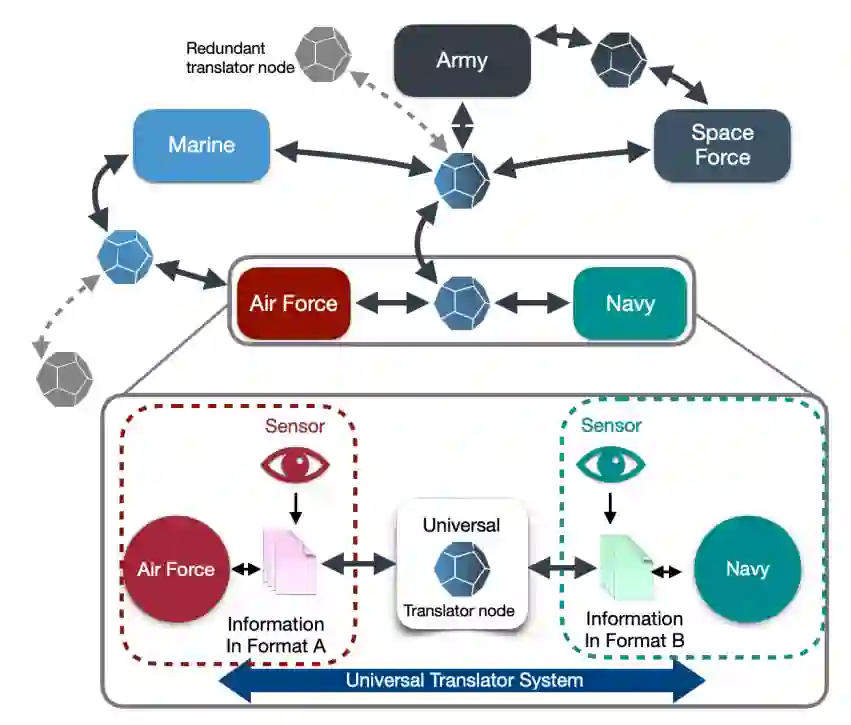 作者建议探索一个新的概念,即通用翻译器基础设施。这个通用翻译器将包括一个嵌入式硬件和软件分布式节点的组合,它将作为所有五个部队/军种以及所有国防部机构的联合网络传感器和资产之间的接口翻译器。图6显示了通用翻译器的网络概念。