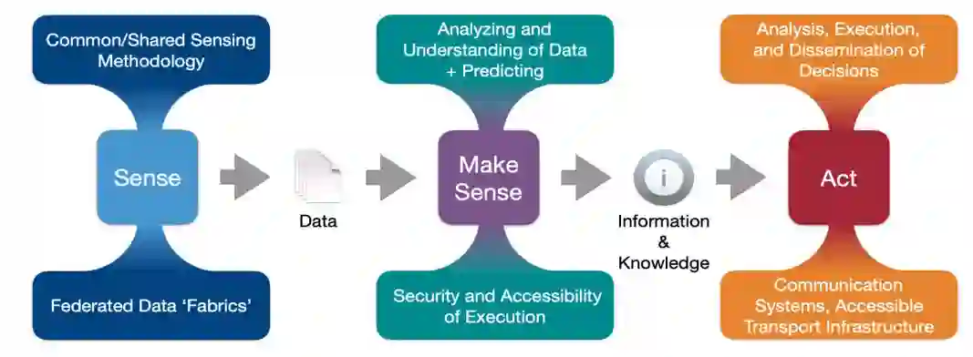 在JADC2的核心中,有三个行动,即感知、理解和对从传感器收集和处理的数据采取行动,这些行动是相互交织的。感知和整合提供了从所有领域和来源发现、收集、汇总和处理数据的能力。然后使用机器学习(ML)和人工智能(Builder等人,1999),数据得到融合、分析和验证。最后一步涉及一个关键的决策过程,这是关于机会2的建议的重点。