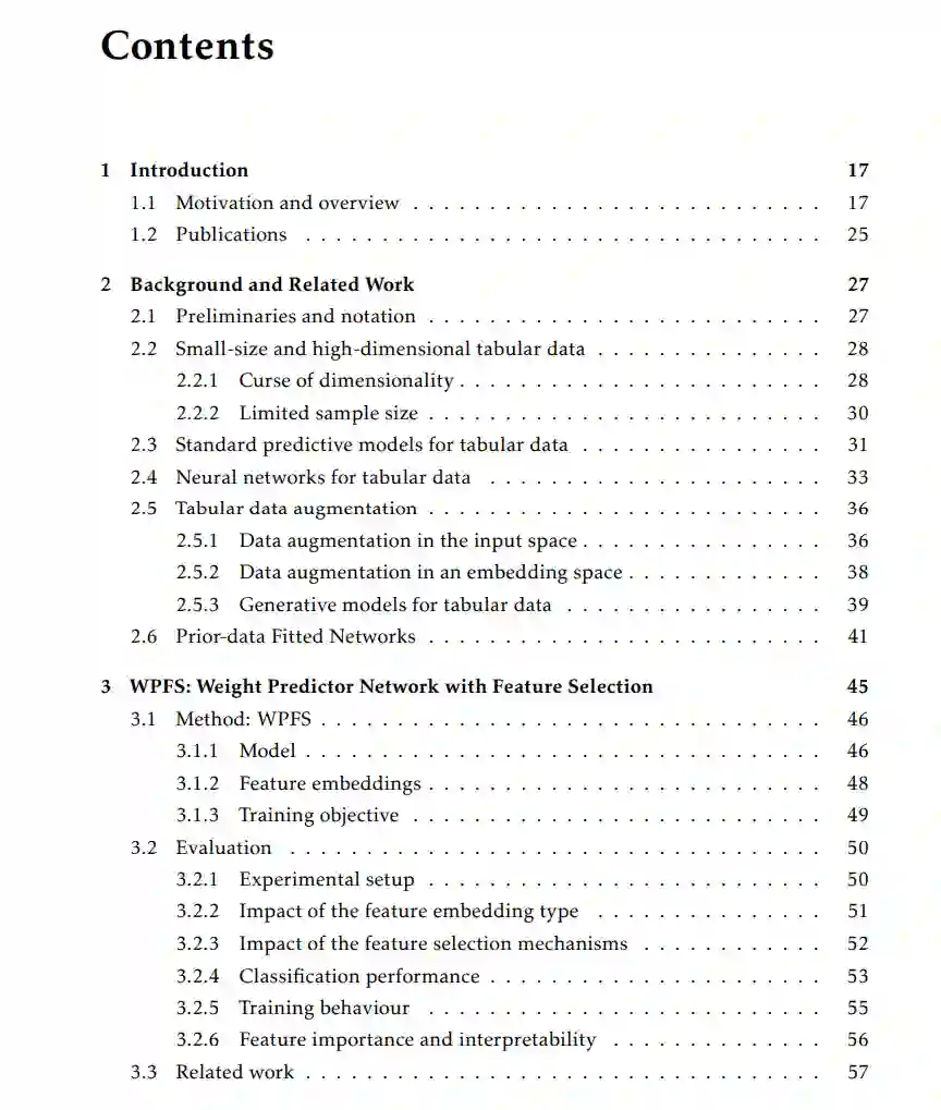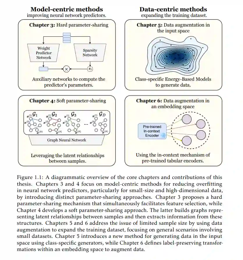 本论文提出了四种新方法,以提高机器学习模型在小样本且高维度表格数据集上的泛化能力。表格数据(其中每一行代表一条记录,每一列代表一个特征)在医学、科学研究和金融等关键领域中广泛存在。然而,由于数据采集的困难,这些领域往往面临数据稀缺的问题,难以获得大样本量。同时,新型数据采集技术使得高维数据的获取变得可能,从而导致特征数量远远超过样本数量的数据集。数据稀缺和高维性对机器学习模型带来了显著挑战,主要原因在于由于维数灾难和样本不足,模型更容易发生过拟合,无法充分刻画数据的潜在分布。现有方法在这类场景下通常难以实现有效泛化,导致性能不尽如人意。因此,在小样本且高维数据集上训练模型需要专门设计的技术,以克服这些限制,并从有限数据中更高效地提取有用信息。 我们提出了两种全新的以模型为中心的方法,以应对小样本和高维数据下神经网络的过拟合问题。我们的关键创新在于通过共享辅助网络来约束模型参数,这些辅助网络捕捉表格数据中潜在的关系,从而在一定程度上决定预测模型的参数,减少其自由度。首先,我们提出了 WPFS,这是一种参数高效的架构,通过权重预测网络对模型参数实施硬参数共享。其次,我们提出了 GCondNet,该方法利用图神经网络(GNNs)实现对底层预测模型的软参数共享。在应用于生物医学表格数据集时,这两种方法主要通过降低过拟合风险,实现了预测性能的提升。 尽管单独依赖模型中心的方法较为常见,但结合数据中心方法往往能带来额外的性能提升,尤其是在数据稀缺的任务中。为此,我们还提出了两种新颖的数据增强方法,用于生成合成数据,以增加训练集的规模和多样性,从而捕捉到数据分布中更多的变异性。我们的关键创新在于将预训练的表格分类器转化为数据生成器,并以两种新方式利用其预训练信息。第一种方法 TabEBM 构建了专门的类别特定能量基模型(EBM),以近似类别条件分布,从而生成额外的训练数据。第二种方法 TabMDA 则引入了上下文内子集划分(ICS)技术,这种技术使得在预训练的上下文分类器所学习的流形空间内进行标签不变转换,进而有效扩充了训练数据集。两种方法均具有通用性、快速性、无需额外训练,并且可以应用于任何下游预测模型。它们均能显著提升分类性能,尤其在小数据集上效果尤为明显。 总体而言,本论文在机器学习领域开辟了新的方向,旨在减轻过拟合问题,并在表格数据的生成与增强方面取得突破。我们的技术在医学、金融和科学研究等普遍面临数据稀缺和高维性难题的领域具有直接应用价值。通过证明即便在有限数据条件下也能实现更高效的学习,这项工作为未来克服数据限制、推广机器学习应用铺平了道路。