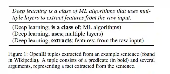 OpenIE(开放信息抽取)以n元关系元组的形式提取事实,即(arg1, predicate, arg2,…, argn),从非结构化文本,而不依赖预定义的本体模式[Niklaus等人,2018]。图1显示了从给定句子中提取的示例OpenIE元组。与传统的(或封闭的)IE系统要求预定义关系相比,OpenIE减少了设计复杂的、领域相关的关系模式的人力劳动。因此,它有可能在最少的人工干预下处理异构语料库。通过OpenIE,可以开发Web规模的无约束IE系统,获取大量的知识。然后,收集的知识可以集成并用于广泛的自然语言处理(NLP)应用,如文本蕴积[Berant et al., 2011],总结[Stanovsky et al., 2015],问题回答[Fader et al., 2014; Mausam, 2016]和显性推理[Fu et al., 2019]。