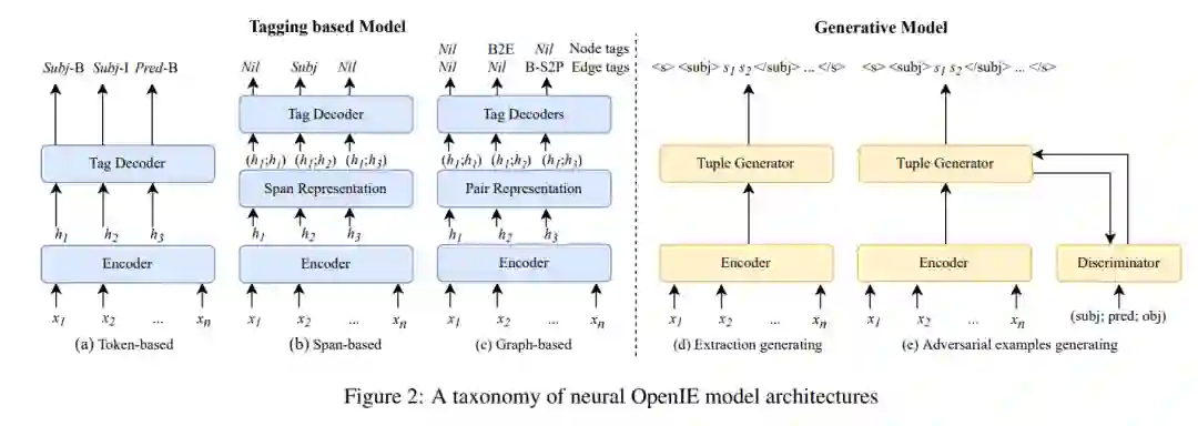 本文系统地回顾了神经OpenIE系统。现有的OpenIE综述[Niklaus et al., 2018; Glauber and Claro, 2018; Claro et al., 2019]关注传统解决方案,并没有很好地涵盖最近的基于神经的方法。由于范式的改变,OpenIE未来研究机会的潜在途径也需要重新考虑。在这项综述中,我们总结了最近的研究进展,分类现有的神经OpenIE方法,确定剩余的问题,并讨论开放的问题和未来的方向。本文的主要贡献如下: 1) 基于神经OpenIE模型的任务公式,提出了神经OpenIE模型的分类方法。然后我们讨论他们的优点和缺点; 2) 我们对OpenIE的背景和评估方法进行了有益的讨论。我们还提供了当前SOTA方法的详细比较;3) 我们讨论了制约OpenIE发展的三个挑战:评估、注释和应用。在此基础上,我们突出未来的方向: 更开放、更专注、更统一。