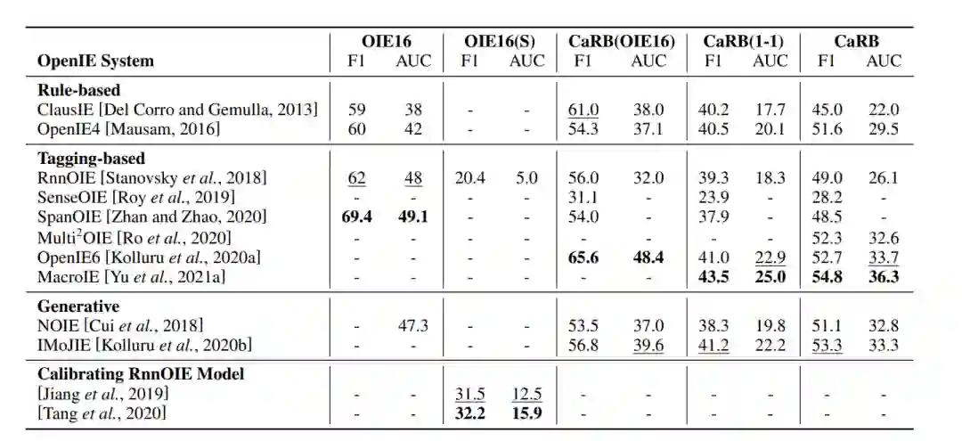 神经OpenIE系统在两个流行的基准OIE2016和CaRB上的性能,每个都有多个部分匹配策略。每个评估设置下的最佳结果(基于可用的分数)以黑体显示,次佳的结果以下划线显示。文献中缺失的结果标记为“-”。由于logcian仅在中国基准上进行评估,而Adversarial-OIE仅在OIE2016上给出了precision-recall曲线,没有AUC评分,因此这两个系统不在这里列出。为了全面起见,我们还包括了两种流行的基于规则的系统,即ClausIE和OpenIE4。