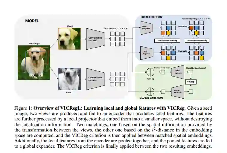 大多数最近的学习图像表示的自监督方法集中于生成具有不变性的全局特征或生成一组局部特征。前者最适合于分类任务,后者最适合于检测和分割任务。本文探讨了学习局部特征和全局特征之间的基本权衡。提出了一种新的VICRegL方法,该方法同时学习良好的全局和局部特征,在保持良好的分类任务性能的同时,在检测和分割任务上取得了优异的性能。具体地说,一个标准卷积网结构的两个相同的分支被提供相同图像的两个不同的扭曲版本。VICReg准则应用于全局特征向量对。同时,VICReg准则应用于出现在最后一个池化层之前的局部特征向量对。如果两个局部特征向量的l2距离小于阈值,或者它们的相对位置与两个输入图像之间的已知几何变换相一致,则它们会相互吸引。我们在线性分类和分割转移任务上展示了强大的性能。代码和经过预先训练的模型可以在https://github.com/facebookresearch/VICRegL上公开获取。