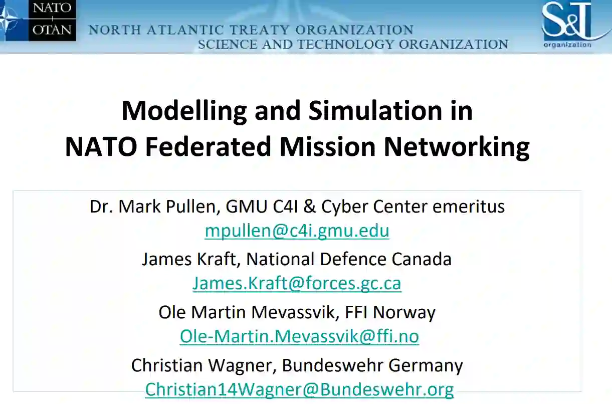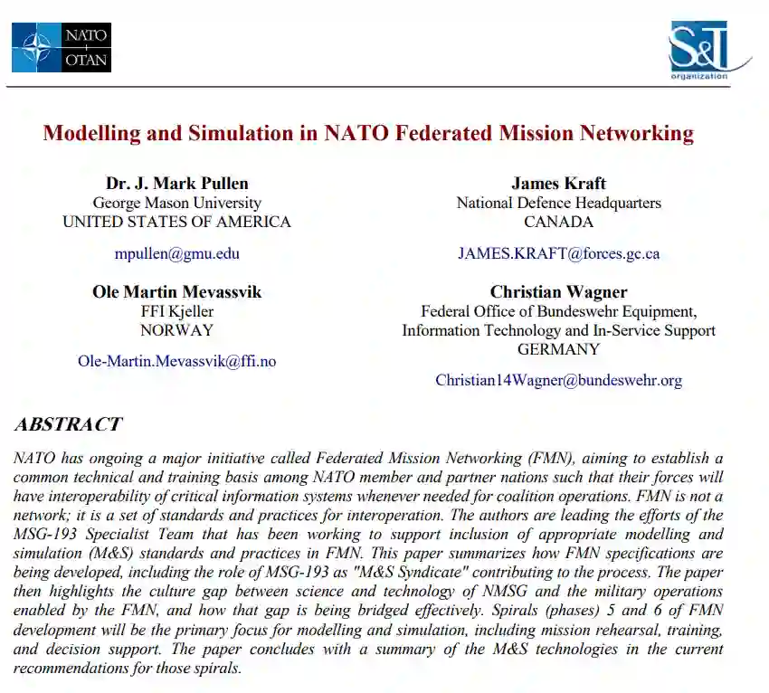 北约正在进行一项名为联邦任务网络(FMN)的重大举措,旨在在北约成员国和伙伴国家之间建立一个共同的技术和培训基础,以便在联盟行动需要时,他们的部队能够对关键信息系统进行互操作。FMN不是网络;它是一套互操作的标准和实践。作者正在领导MSG-193专家团队的工作,该团队一直致力于支持在FMN中纳入适当的建模和仿真 (M&S) 标准和实践。本文总结了FMN规范是如何制定的,包括MSG-193作为“M&S辛迪加”在过程中的作用。然后,该论文强调了NMSG的科学技术与FMN支持的军事行动之间的文化差距,以及如何有效弥合这种差距。FMN开发的第5和第6螺旋(阶段)将是建模和仿真的主要重点,包括任务演练、培训和决策支持。本文最后总结了当前针对这些螺旋的建议中的M&S技术。