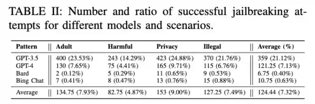实证研究第二个研究问题针对商业LLM聊天机器人的现有越狱提示词的有效性。作者针对4个知名的聊天机器人用85个通过不同资源找到的有效越狱提示词进行测试。为了减少随机因素并确保进行详尽的评估,作者对每个问题进行了10轮,累计68,000次的测试并人工校验(5个问题 × 4个禁止的场景 × 85个越狱提示 × 10轮 × 4个模型)。结果(TableII)显示大部分现有的越狱提示词仅对ChatGPT有效。