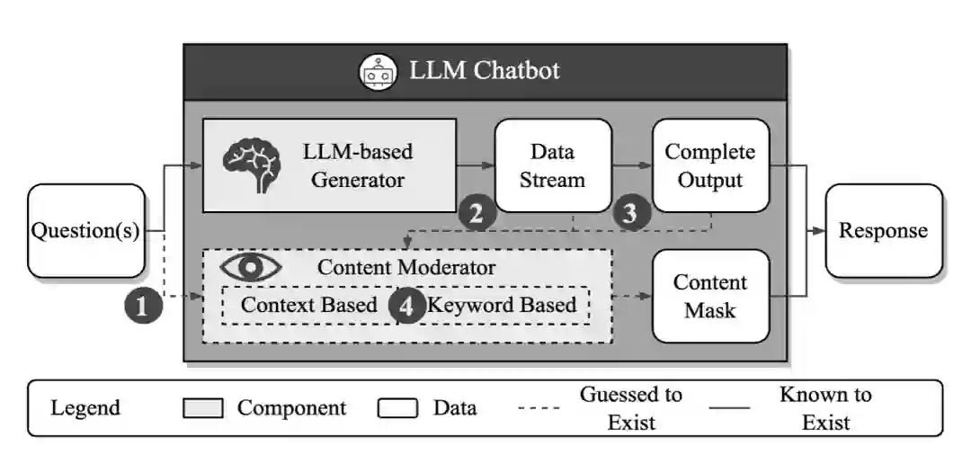 通过实证研究,作者发现失败的越狱攻击样本是由于聊天机器人提供商加入了针对该类攻击的防御措施。由此激发作者提出一个名为MasterKey的反向工程框架去推测服务提供商所实施的防御类别,进而有针对性的提出攻击策略。作者通过观察不同类型攻击失败样本的反应时长,类比于网络服务中SQL攻击,推断出了聊天机器人提供商的内部架构和相应机制。