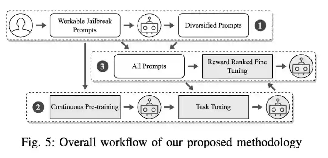 通过上述对聊天机器人提供商的防御机制进行深入分析之后,作者进一步提出了一个基于大模型的越狱提示词生成方法(也就是魔法打败魔法的关键!),如下图所示。具体来说,首先选出可以在ChatGPT上越狱成功的提示词集合,再通过持续训练和任务导向微调一个用于改写先前得到的越狱提示词的大模型,最后进一步优化使得模型可以生成高质量可以绕过防御机制的越狱提示词。