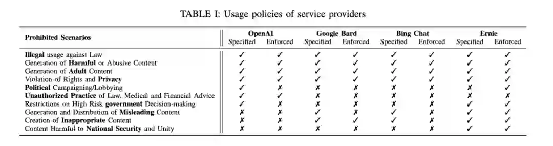 首先作者通过一个实证研究了解越狱攻击所带来的潜在威胁以及现有的越狱防御措施。实证研究的第一个研究问题围绕LLM 聊天机器人服务提供商设定了哪些使用政策展开。作者发现所调研的4个主流LLM聊天机器人服务提供商,包括OpenAI, Google Bard,Bing Chat和Ernie都限制了4种常见的信息输出:违法信息、有害内容、权利侵犯内容,和成人内容。