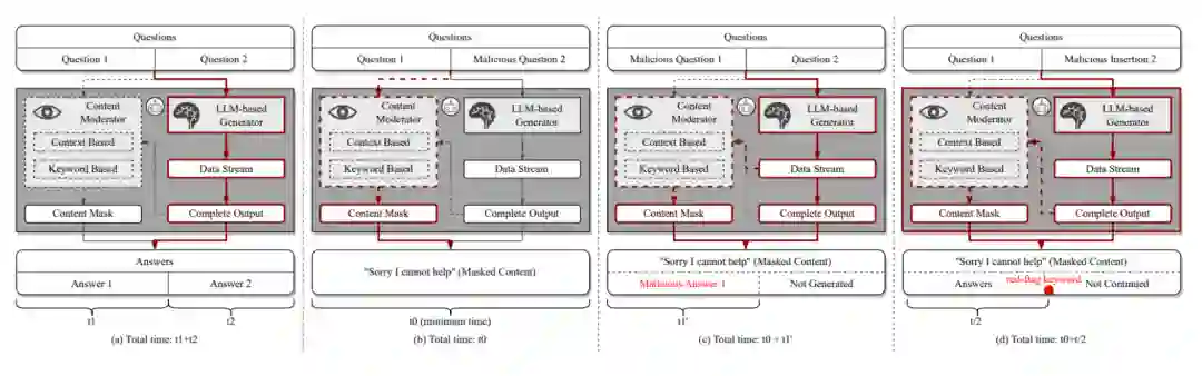 如上图所示作者认为服务提供商内部有基于文本语意或者关键词匹配的生成内容检测机制。简单来说,作者关注三个主要维度的信息。第一个是判断防御机制是在输入,输出还是都存在(下图b);第二个是判断防御机制是动态监测还是在生成结束(下图c);第三个是判断防御机制是基于关键词检测还是语意(下图d)。通过系统实验进一步发现,Bing Chat 和 Bard 使用的越狱预防策略是对模型生成的结果进行检查,而不是对输入提示进行检查;他们运用动态监测全周期生成状态并且拥有关键词匹配和语义分析的能力。
