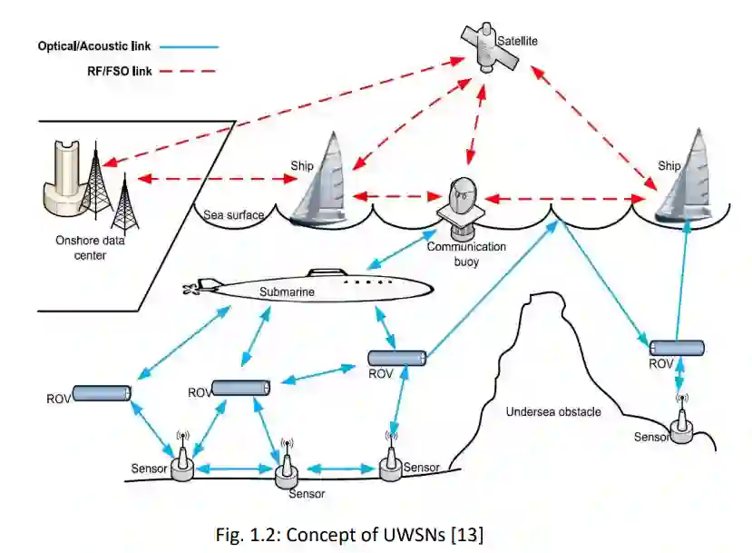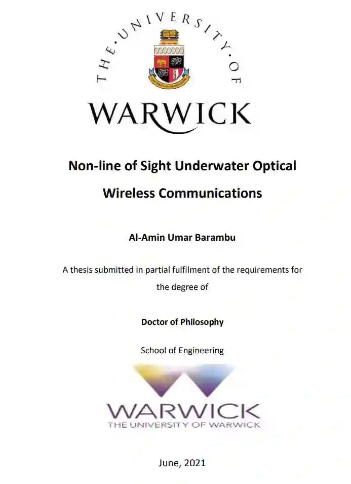 与现有的声学技术相比,水下光无线通信(UOWC)具有每秒百万比特(Mbps)到每秒千兆比特(Gbps)的高数据传输速率,而且由于光在水中的高速运转,其延迟时间更短,因此最近已成为一个重要的研究课题。目前,部署在水下的遥控潜水器(ROV)和自动潜航器(AUV)等无人设备的数量不断增加,它们需要高容量和高带宽来传输水下信息。由于水下深处存在危险和风险,潜水员无法深入水下执行任务。本论文主要研究和探讨非视线(NLOS)UOWC 的性能,因为它是设计实用系统的一种更现实的方法。这是因为在实际场景中,由于受到海洋生物、气泡、大型悬浮颗粒和海底特征的阻碍,视线(LOS)通信链路并不总是可行的,尤其是在沿海和浑浊的水域环境中。当发射器和接收器为非稳态节点时,视距链路也不适用。