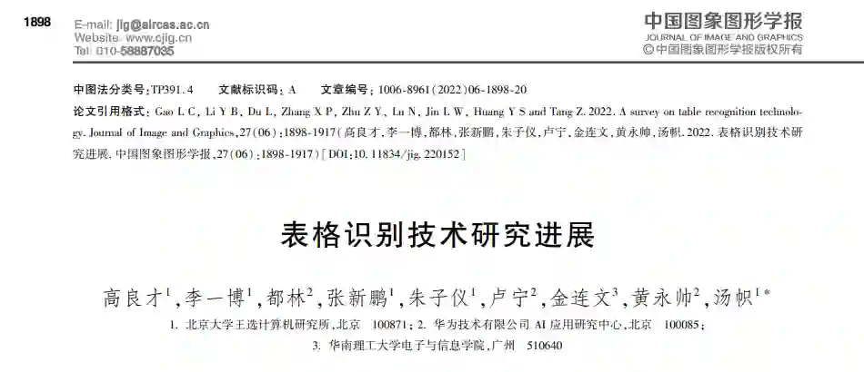 在大数据时代,高效地存取数据,以及从海量数 据中提取有效信息是各行各业都亟需利用的重要技 术。 表格作为数据的一种重要载体,具有信息精炼集 中、方便体现数据关系等特点,已经在各个行业得到 了广泛应用。 在教育领域中,表格常常会出现在各类 试卷、题目中;在金融领域,表格用来展示和分析数 据;在科学领域,表格用来记录各类实验配置以及结 果;在现实生活中也常常在幻灯片、车站时刻牌上看 到表格。 因此对表格进行区域检测、结构识别乃至对 其中信息进行识别理解都有着广阔的应用前景。 表格在生成或存储过程中往往以图片或 PDF (portable document format)文件的形式存在,会丢失 易于计算机理解的原有结构信息。 若是采用人工手 段对表格进行重新处理录入,会面临效率低下、数据 量大导致出错等问题。 因此,如何让计算机从文档 或图像中自动识别表格、提取信息,成为文档识别领 域一个重要的研究问题。 早期对于表格的识别大多是针对较为简单或模 板化的表格。 从表格的布局结构出发,抽取表格线 条或抽取文本块,然后使用规则方法进行分析,但这 些方法往往泛化能力较差,且难以处理复杂表格。 随着深度学习的发展,无论是机器视觉方面还是自 然语言处理方面都获得了巨大的进展,各种表格识 别的方案相继提出,并有研究者开始尝试对自然场 景下的表格进行处理。 本文将围绕表格的区域检测、表格结构识别和 表格内容识别 3 个表格识别子任务,从传统方法、深 度学习方法等方面,综述该领域国内国外的发展历 史和最新进展,同时对国内国外的研究进行对比,对 未来的趋势和技术发展目标进行展望。