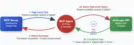 图1. 解耦的双段命令与控制通信流程概念图。MCP代理充当代理,向公共LLM发送看似良性的高层级查询(2a),LLM返回详细的多步骤攻击计划(2b)以供执行。