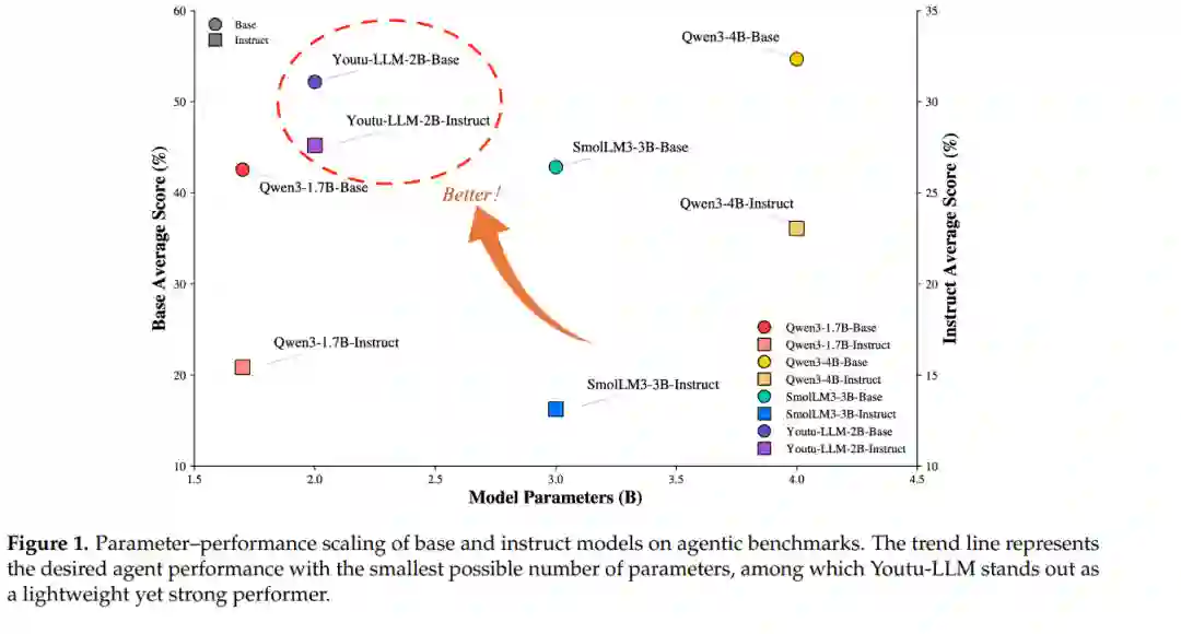 我们推出了 Youtu-LLM,这是一款轻量且强大的语言模型,它成功兼顾了高计算效率与原生智能体能力。不同于依赖知识蒸馏的典型小模型,Youtu-LLM(规模为 1.96B)采用从零开始的预训练方式,旨在系统性地培养推理与规划能力。其核心技术突破如下: (1) 支持长上下文的紧凑型架构:Youtu-LLM 基于稠密的多隐变量注意力(Multi-Latent Attention, MLA)架构,并构建了全新的面向 STEM 的词表,支持高达 128k 的上下文窗口。该设计使其能够在极小的内存占用下实现鲁棒的长文本推理与状态跟踪,是处理长程智能体及推理任务的理想选择。 (2) 原则性的“常识-STEM-智能体”课程化训练:我们策划了约 11T tokens 的海量语料库,并实施了多阶段训练策略。通过将预训练数据分布从通用常识逐步转向复杂的 STEM 和智能体任务,我们确保模型获得深层认知能力,而非表层对齐。 (3) 可扩展的智能体中期训练(Mid-training):针对智能体能力的专项中期训练,我们采用多样化的数据构建方案,在数学、编程和工具调用领域合成了丰富且多样的执行轨迹。这些高质量数据使模型能够有效地内化规划与反思行为。 广泛的评估结果表明,Youtu-LLM 树立了 2B 以下规模大语言模型的新标杆。在通用基准测试中,它展现出可与更大型模型竞争的性能;而在智能体特定任务中,它显著超越了现有的先进基准(SOTA),证明了轻量化模型同样可以具备强大的内在智能体能力。