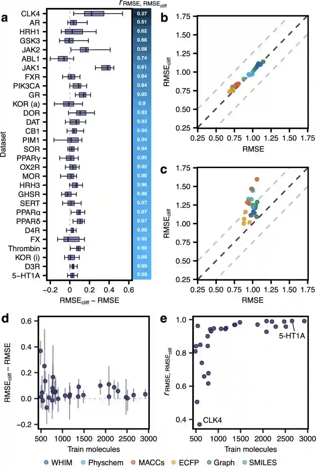 图5 比较整体模型性能和活性悬崖化合物性能。根据Pearson相关系数对整体的RMSE和和RMSEcliff排序所有方法在所有靶标上的差异。误差线指示最低和最高RMSEcliff。(b) 所有方法在5-HT1A上的RMSE和RMSEcliff的比较。(c) 所有方法在CLK4上的RMSE和RMSEcliff之间的比较。(d)训练分子数量对RMSE与RMSEcliff之间差异的影响。误差线指示最低和最高RMSEcliff。(e) 训练分子的数量与RMSE和RMSEcliff的皮尔逊相关性(r)之间的关系。